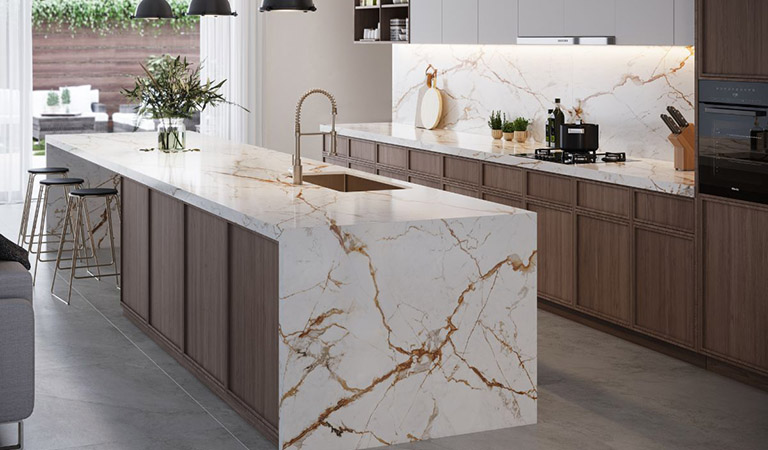 Kính giả đá là giải pháp sang trọng cho người yêu thích vẻ ngoài tự nhiên. Hiệu ứng vân đá giúp kính có chiều sâu và cảm giác hiệu ứng như đá thật, đồng thời vẫn giữ lợi thế về tuổi thọ, dễ lau chùi và không bị ố màu theo thời gian – rất thích hợp cho bếp cao cấp năm 2025