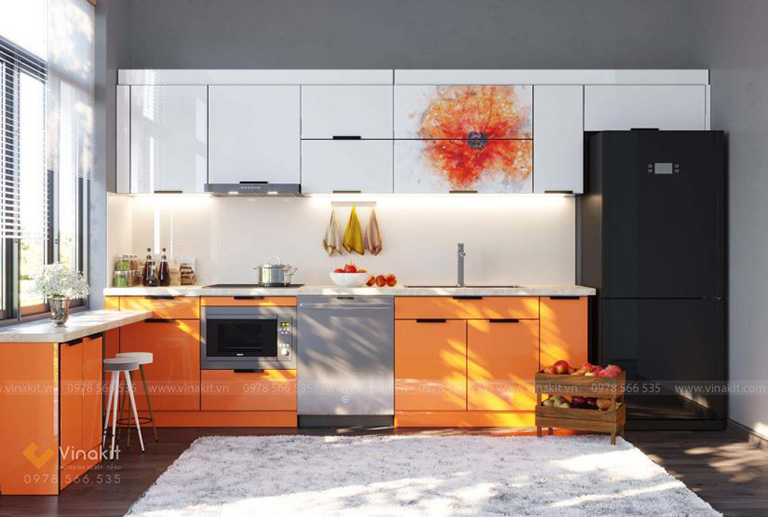Màu cam cháy mang đến cảm giác ấm áp và hiện đại. Tủ bếp thiết kế 2 tầng với hệ tủ bếp trên, kính ốp bếp màu trung tính giúp làm dịu tổng thể, cân bằng năng lượng mạnh mẽ của người mệnh Hỏa. Kết hợp cùng những phụ kiện tủ bếp mang đến sự tiện dụng và thẩm mỹ cho toàn bộ căn bếp.