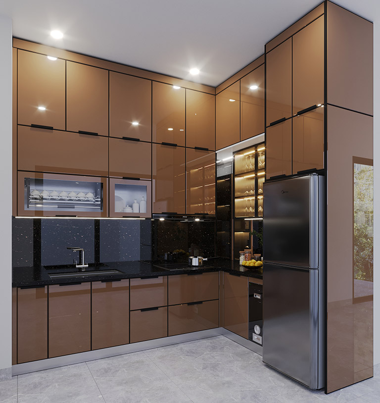 Tone nâu ánh kim mang tính Mộc – Hỏa tương sinh, phù hợp với gia chủ yêu thích phong cách Đông Dương hiện đại. Mẫu tủ bếp 2 tầng này sử dụng inox cánh kính cao cấp, dễ lau chùi, chống ẩm và chịu nhiệt tốt.