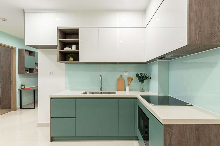 Mẫu tủ bếp 2 tầng màu xanh – mang thiên nhiên xanh mát vào trong căn bếp