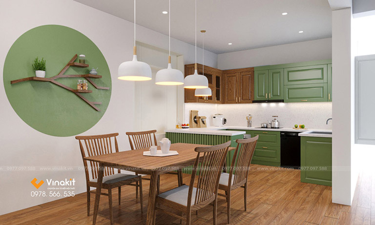 Bên cạnh đó, đội ngũ thiết kế của Vinakit luôn chú trọng lựa chọn màu sắc như đỏ, cam, hồng, tím hay xanh lá cây – những gam màu kích hoạt năng lượng tích cực, thu hút tài lộc. Bố cục được tính toán khoa học: tránh bếp đối diện chậu rửa hay tủ lạnh (Thủy khắc Hỏa), đồng thời tận dụng ánh sáng tự nhiên, mang lại cảm giác thông thoáng và ấm cúng cho gian bếp.