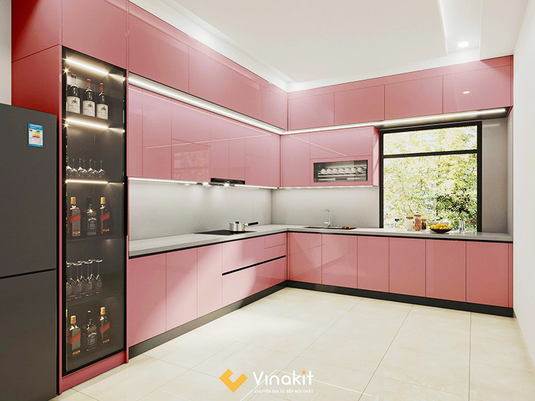 Hồng đất là tone màu nhẹ nhàng, và nằm trong nhóm màu hợp Hỏa. Kết hợp tủ bếp cánh Acrylic bóng gương hiện đại với ánh sáng vàng dịu sẽ mang lại cảm giác ấm cúng, thư giãn và tinh tế cho căn bếp.