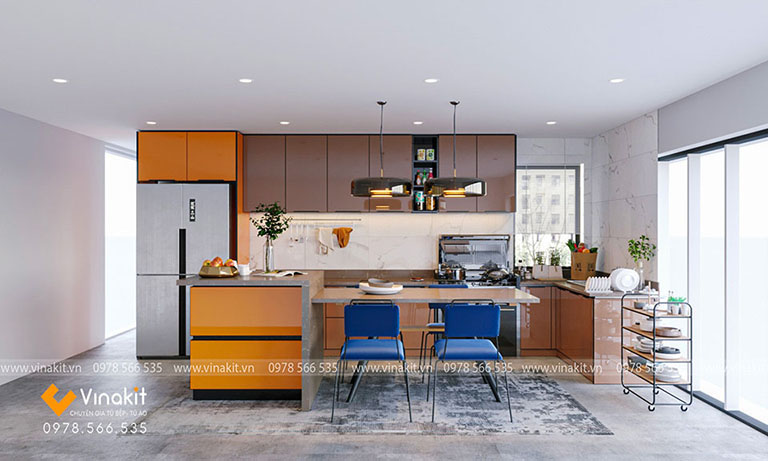 Tủ bếp 2 tầng màu cam kết hợp màu nâu – không gian bếp đầy cá tính