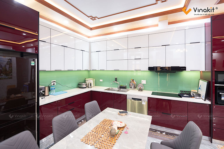 Màu đỏ là gam màu đặc trưng cho mệnh Hỏa, tượng trưng cho sự may mắn, năng lượng và quyền lực. Tủ bếp 2 tầng với cánh kính màu đỏ rượu kết hợp phần cánh tủ màu trắng mang đến tổng thể sang trọng và đậm cá tính. Nét hiện đại trong thiết kế, kết hợp cùng áng sáng mang đến một không gian bếp hoàn toàn tinh tế.
