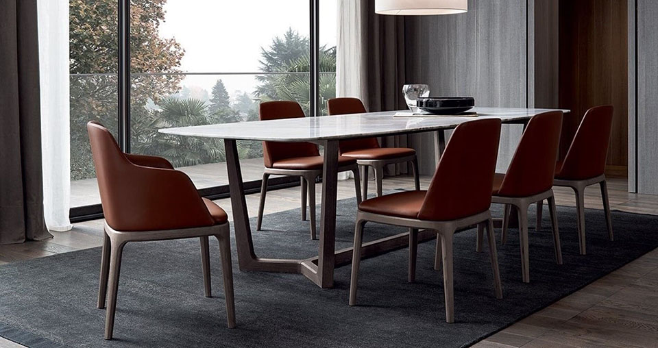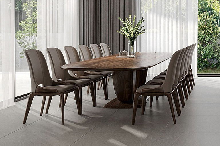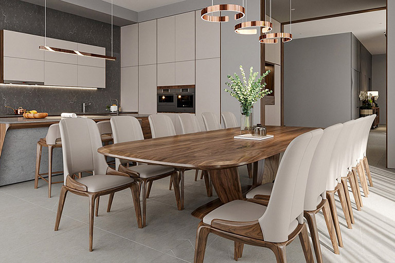 Những bộ bàn ghế phòng ăn hiện đại sang trọng thường được làm từ đá nhân tạo gốc thạch anh hoặc kính cường lực kết hợp với khung gỗ óc chó, gỗ sồi, hoặc chân sắt mạ tinh tế. Mặt bàn đá hoặc kính mang lại vẻ ngoài bóng bẩy, dễ lau chùi, đồng thời chịu lực và nhiệt tốt. Chân bàn được xử lý tỉ mỉ, mang đến cảm giác vững chắc và thẩm mỹ tinh tế trong từng chi tiết nhỏ.