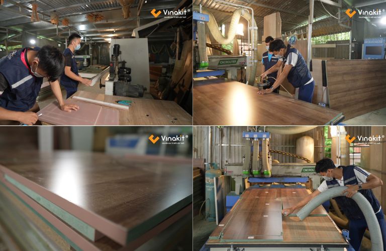 Với gỗ công nghiệp, Vinakit sử dụng công nghệ CNC hiện đại và quy trình gia công bằng cam chốt thay vì ke vít, giúp các sản phẩm đạt độ chính xác cao, chắc chắn và tăng tính thẩm mỹ. Không cắt tay – không dán cạnh thủ công – không lộ vít, đây chính là sự khác biệt giúp sản phẩm luôn tinh gọn, sang trọng và bền bỉ.