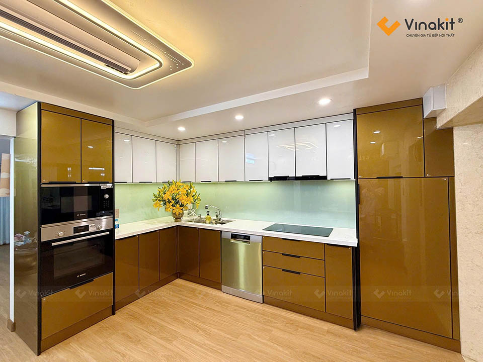Chị chọn mẫu tủ bếp inox cánh kính màu nâu ánh kim kết hợp trắng ngọc trai, phối cùng nền gỗ sáng và kính ốp tường xanh mint dịu mắt – tạo nên một không gian bếp hiện đại, sang trọng và ấm cúng.