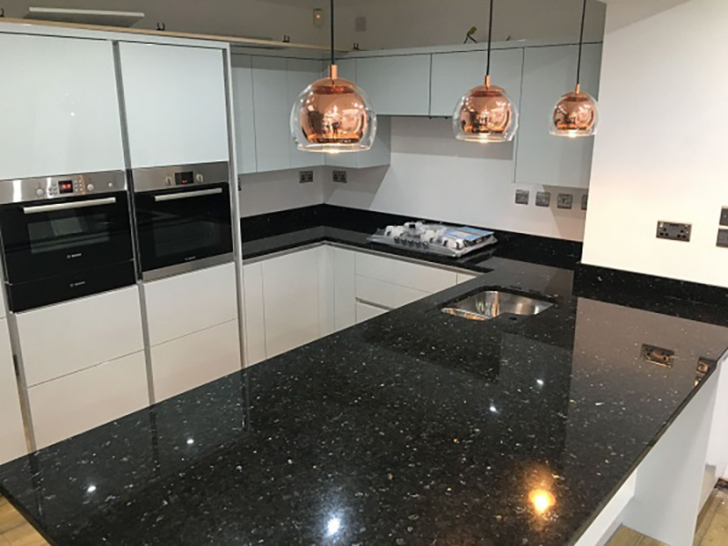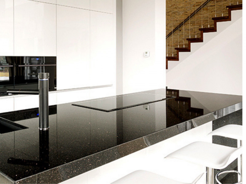 Đá kim sa đen là một trong những loại đá tự nhiên được ưa chuộng nhất hiện nay nhờ vẻ đẹp sang trọng và độ bền vượt trội. Với bề mặt đen tuyền điểm xuyết những hạt ánh kim lấp lánh, loại đá này không chỉ tạo điểm nhấn ấn tượng cho không gian bếp mà còn dễ dàng phối hợp với nhiều phong cách thiết kế khác nhau. Về mặt chất lượng, đá kim sa đen có khả năng chịu nhiệt, chống trầy xước và hạn chế thấm nước khá tốt – những yếu tố rất cần thiết trong môi trường bếp thường xuyên tiếp xúc với dầu mỡ, nhiệt độ cao và độ ẩm.
