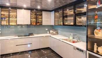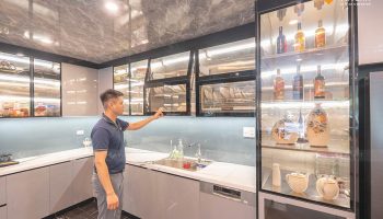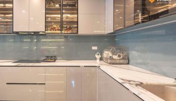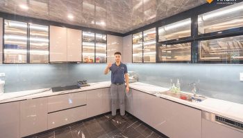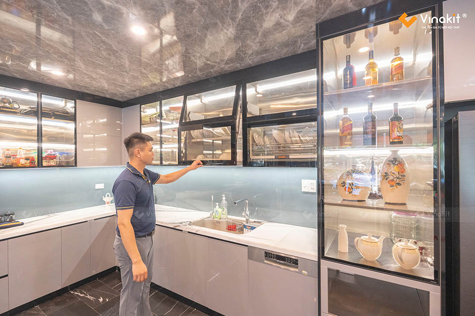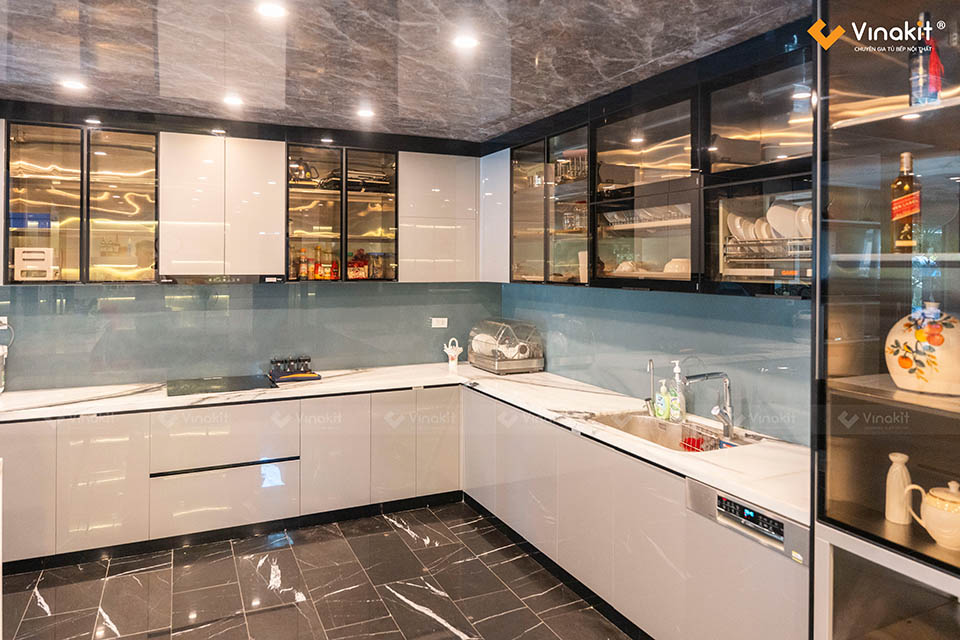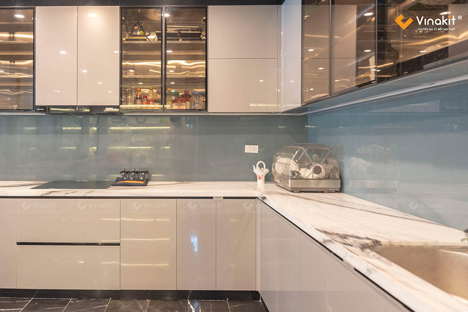 - Dự án: Công trình tủ bếp khung Inox 304, hệ modul rời – cánh kính cường lực Vinakit + cánh Acrylic bóng gương An Cường.