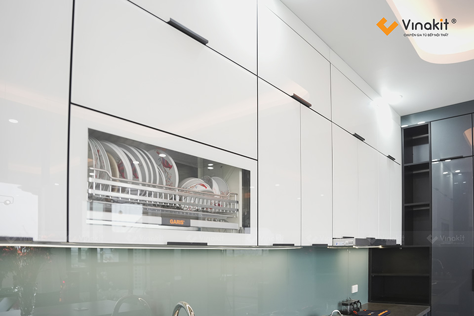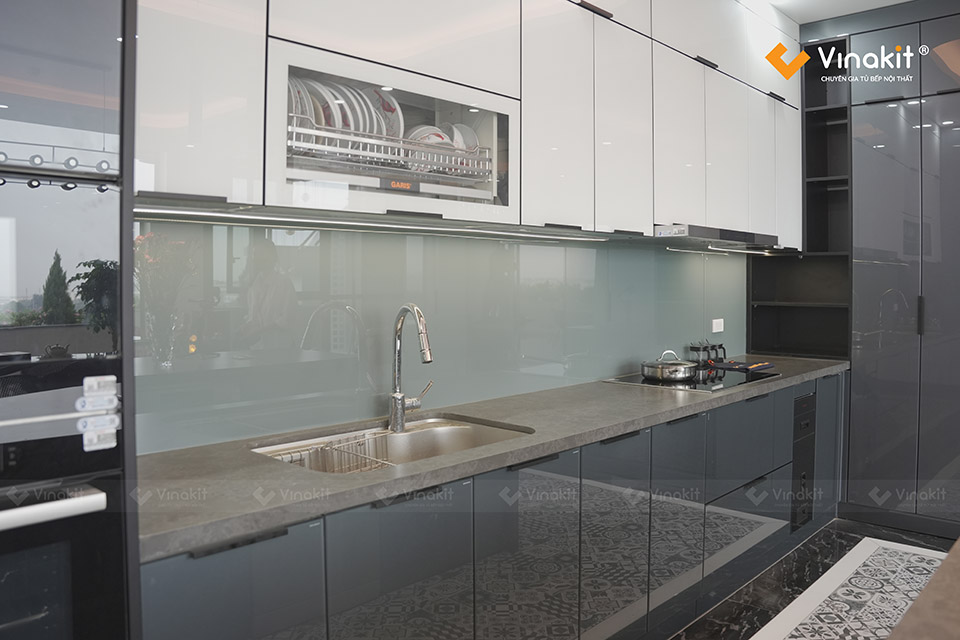 - Màu sắc bộ tủ bếp: Gia chủ lựa chọn màu xám đậm kết hợp màu trắng, mang lại cái nhìn sang trọng và sạch sẽ cho toàn bộ căn bếp.