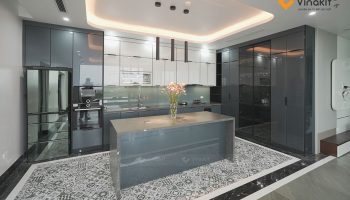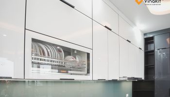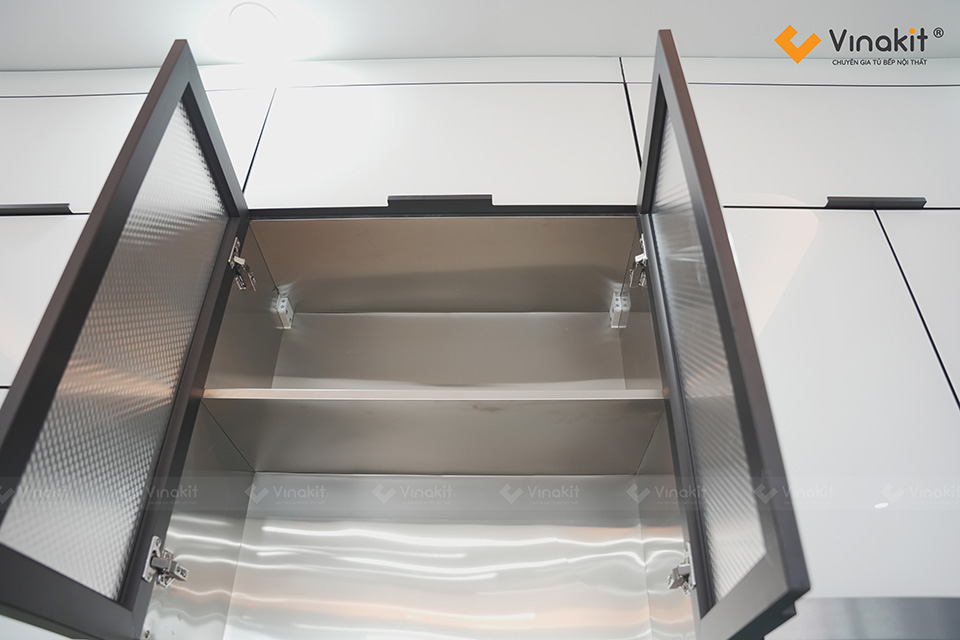 - Các hệ tủ bếp trên, tủ bếp sát trần, tủ bếp dưới chiều cao vượt chuẩn, hệ tủ kho kết hợp tủ thiết bị, tủ nóc tủ lạnh đều được làm từ khung Inox 304 hệ modul rời – Cánh kính cường lực Vinakit.