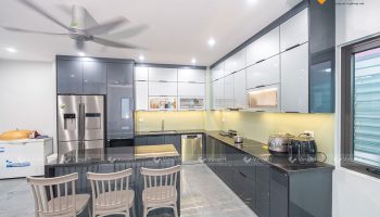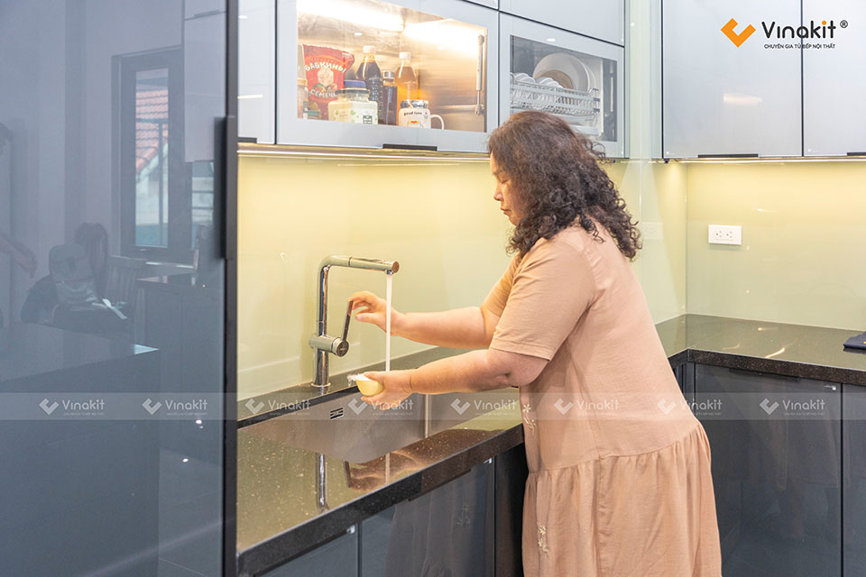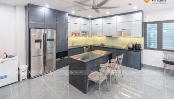 - Dự án: Công trình tủ bếp khung Inox 304, hệ modul rời – cánh kính cường lực Vinakit.