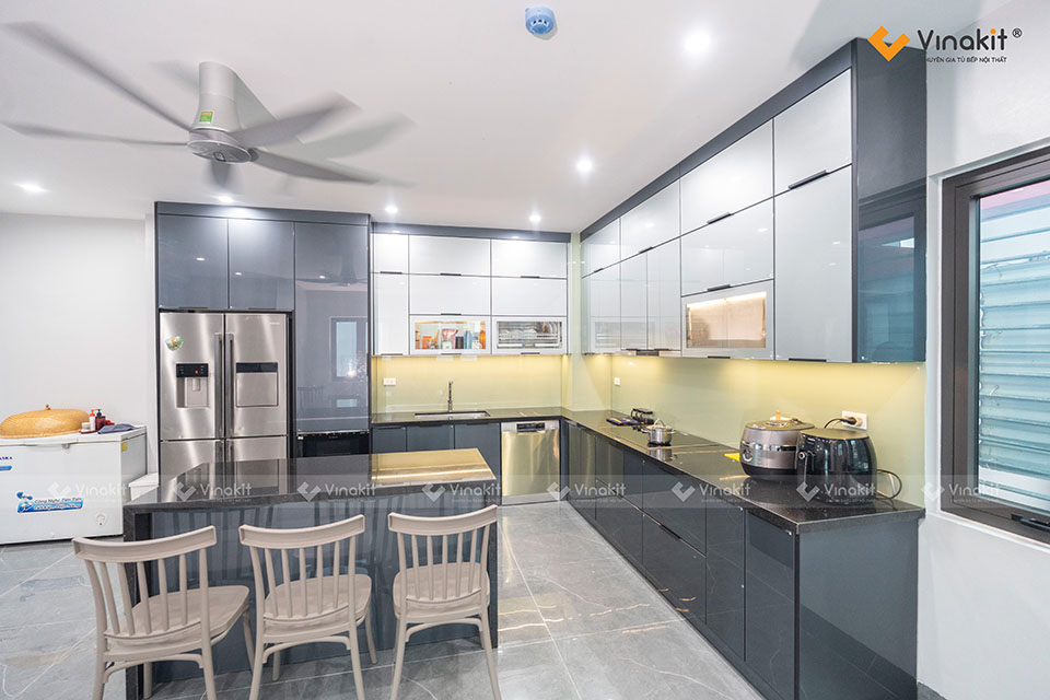 - Màu sắc bộ tủ bếp: Sử dụng tông màu xám mang đến sự sang trọng và tinh tế.
