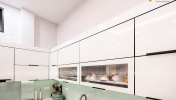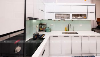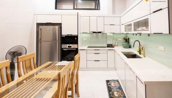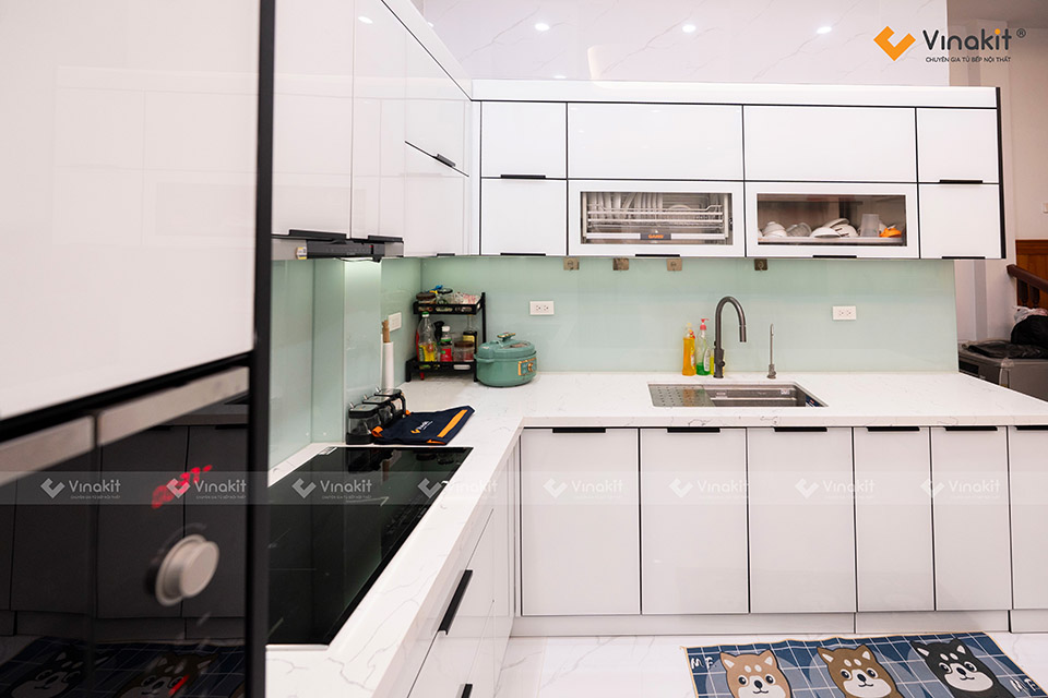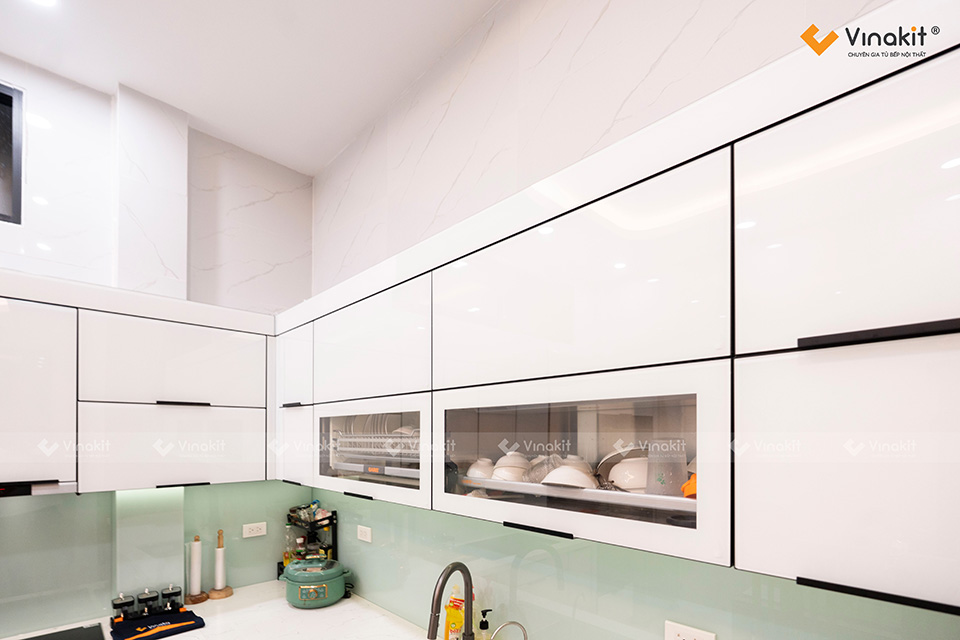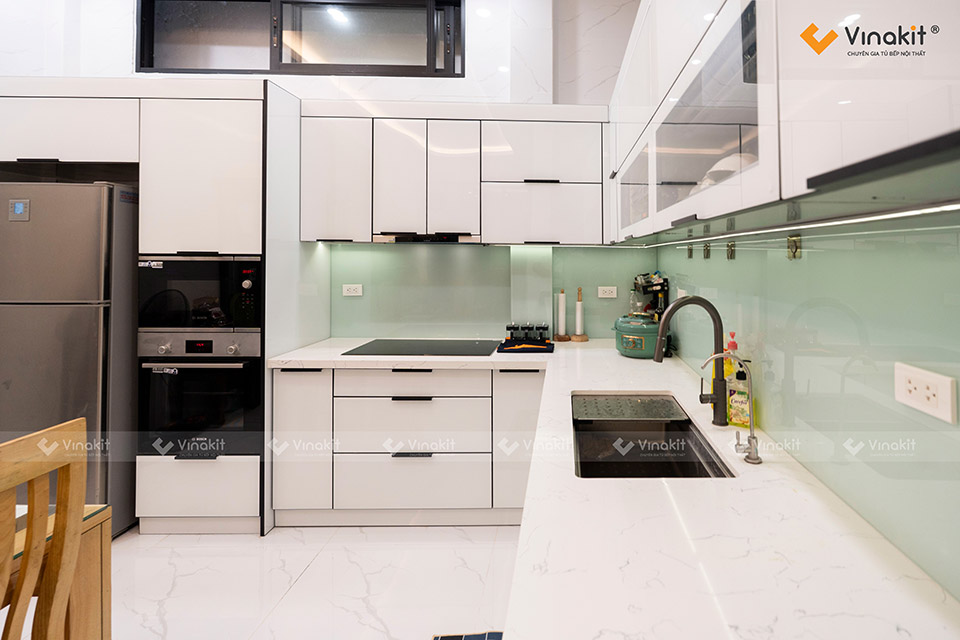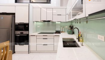 - Màu sắc bộ tủ bếp: Sử dụng tông màu trắng cho toàn bộ hệ tủ bếp mang đến vẻ đẹp sáng tinh khôi cho tổng thể căn bếp.