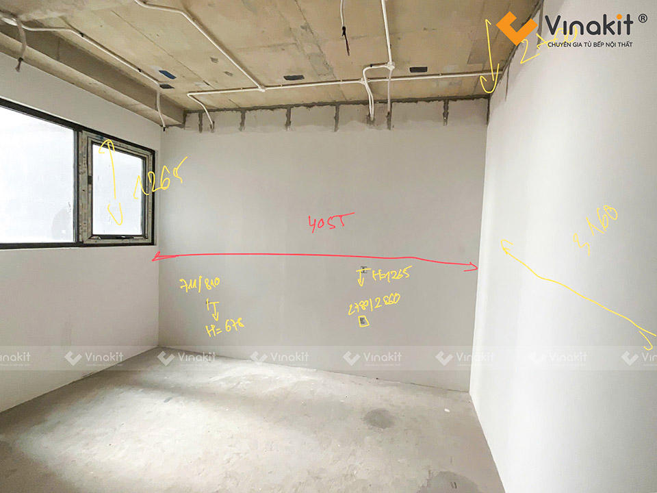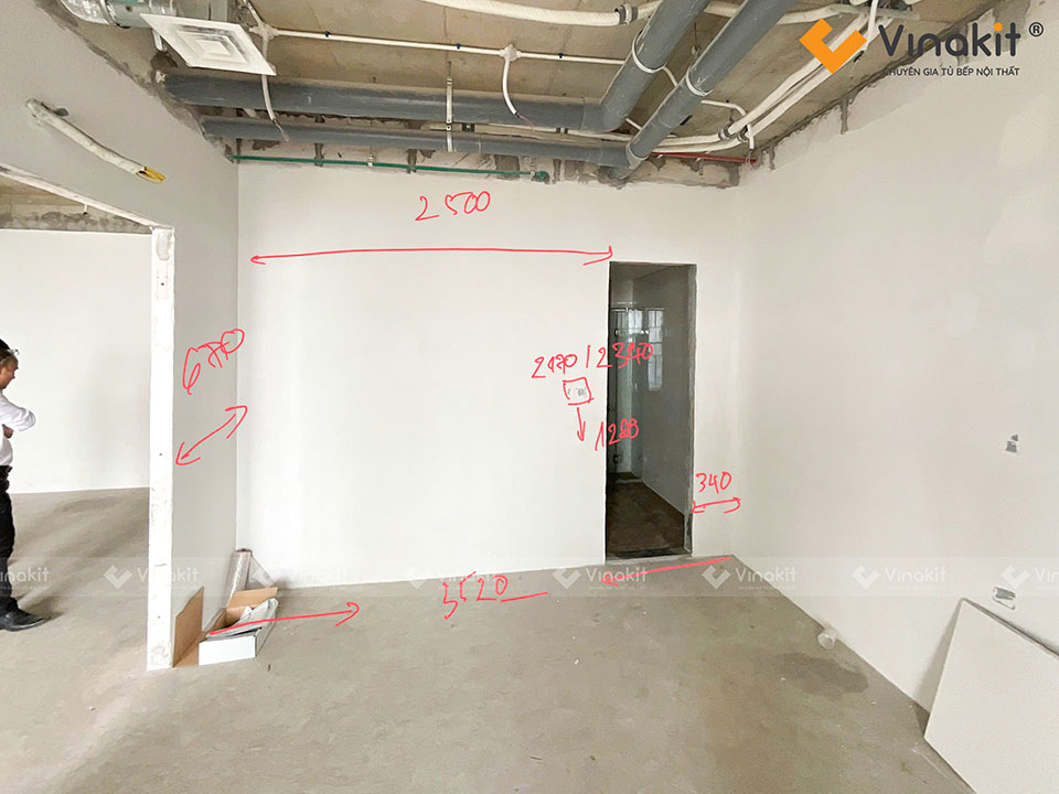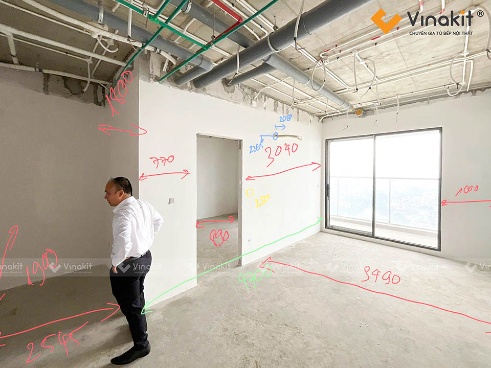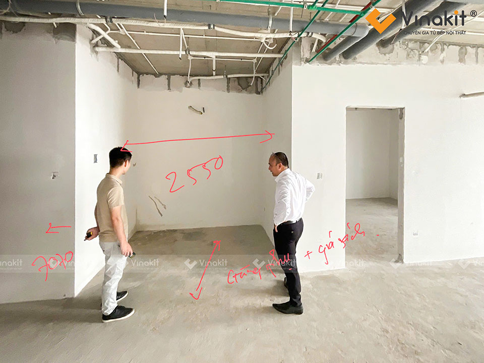 Bước khảo sát công trình được coi là vô cùng quan trọng trong việc thi công, lắp đặt nội thất tủ bếp tại nhà khách hàng. Đây là giai đoạn giúp đội ngũ kỹ thuật Vinakit nắm rõ thực tế không gian, đo đạc chính xác từng kích thước, kiểm tra hệ thống điện – nước, tường và sàn để đảm bảo bản vẽ thiết kế phù hợp tuyệt đối với hiện trạng.