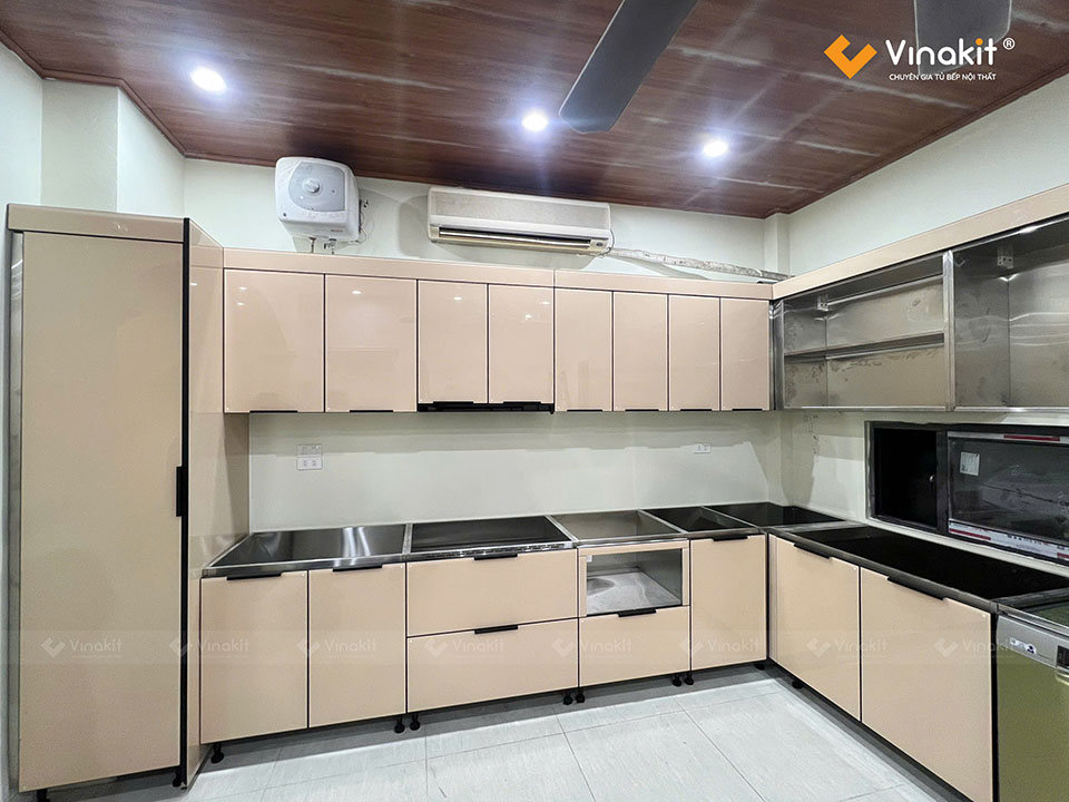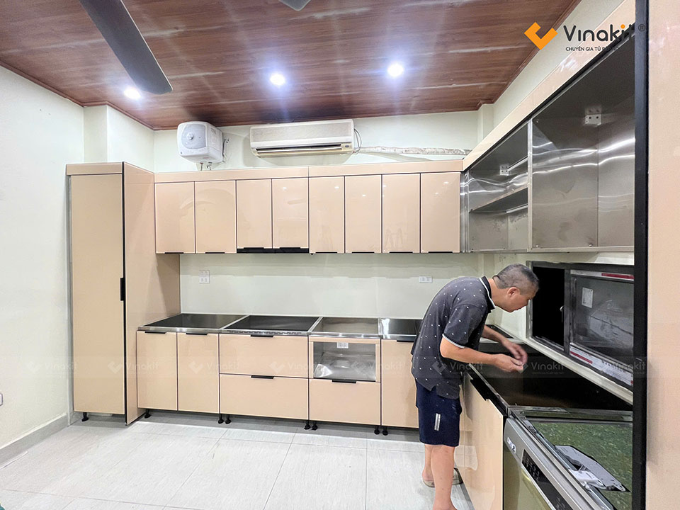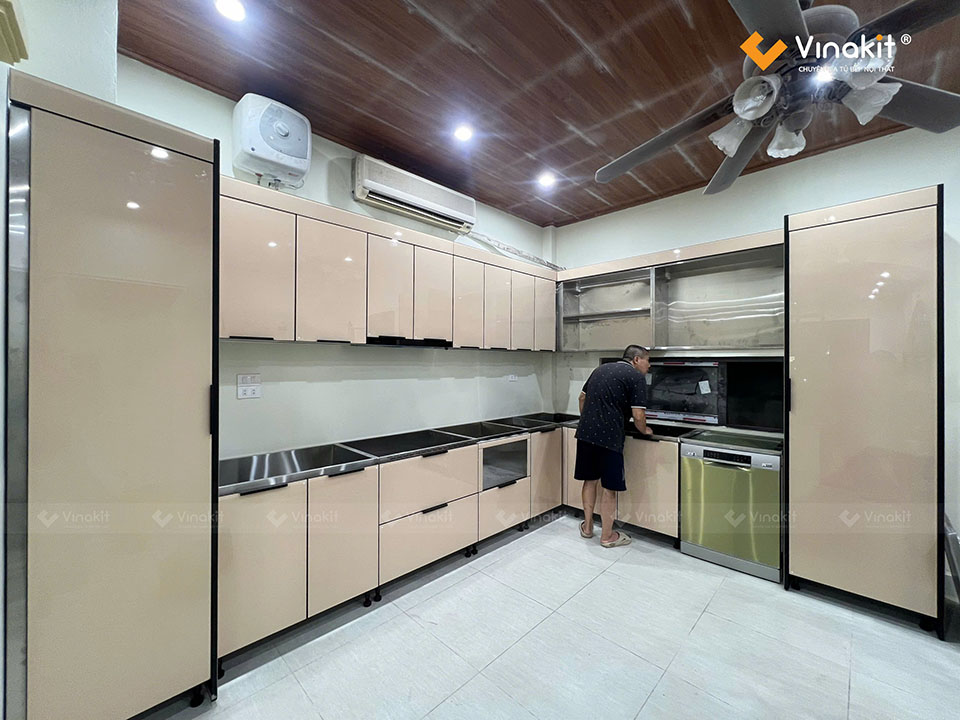 Công trình tủ bếp Inox cánh kính nhà anh Nghĩa – Ba Đình – Hà Nội được Vinakit thiết kế riêng để phù hợp với điều kiện không gian và sinh hoạt của gia chủ. Mẫu tủ sử dụng khung Inox Inox 304 CNC Vinakit 2026. Đây là bản mới nhất của Vinakit, nghiên cứu và sản xuất độc quyền với những ưu điểm vượt trội. Inox 304 với độ dày 0.6mm (dày nhất trên thị trường) mang đến cho hệ tủ sự cứng chắc, bền bỉ với thời gian, dễ dàng vệ sinh và bảo trì, bảo dưỡng.