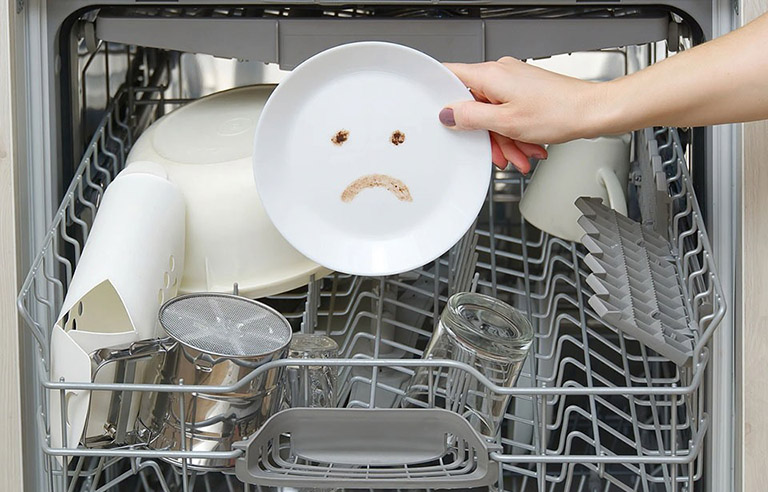 - Do anh chị sắp xếp chén bát xoong nồi không đúng quy cách dẫn đến vòi phun của máy không tới được vị trí vết bẩn.