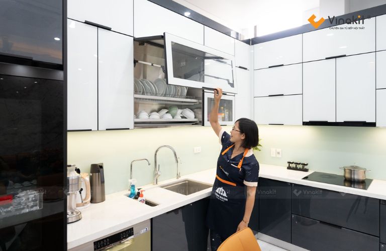 - Tủ bếp dưới: Thường dùng cho bát đĩa đã khô, hoặc kết hợp với máy rửa bát.