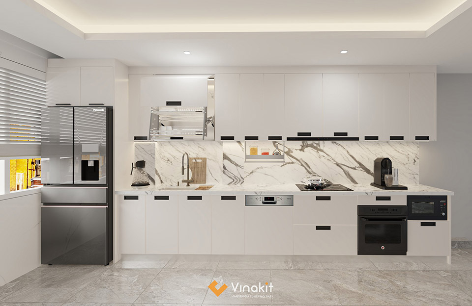 Mẫu tủ bếp gỗ công nghiệp cánh Melamine ME16 của gia đình khách hàng chị Linh Anh – Quận Phú Nhuận – TP. Hồ Chí Minh. Sử dụng gam màu trắng tươi sáng làm sáng bừng cả căn phòng. Hệ tủ bếp sử dụng gỗ công nghiệp chuẩn An Cường, cánh Melamine cốt MDF chống ẩm An Cường. Thiết kế được hoàn thiện và thi công bởi đội ngũ KTS Vinakit.