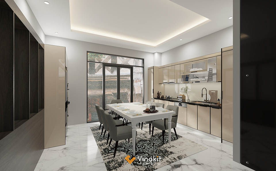 - Bộ tủ bếp gồm hệ tủ kịch trần chữ I tối ưu diện tích lưu trữ đồ dùng giúp không gian phòng bếp luôn gọn gàng ngăn nắp. Kết hợp bàn đảo vừa là nơi chế biến đồ ăn nhẹ, vừa là nơi bày biện món ăn trang trí đẹp mắt, vừa có thể là bàn ăn. Bộ tủ bếp xu hướng thịnh hành tương lai, giúp phòng bếp đẹp như phòng khách, vừa nấu nướng vừa có thể thư giãn…