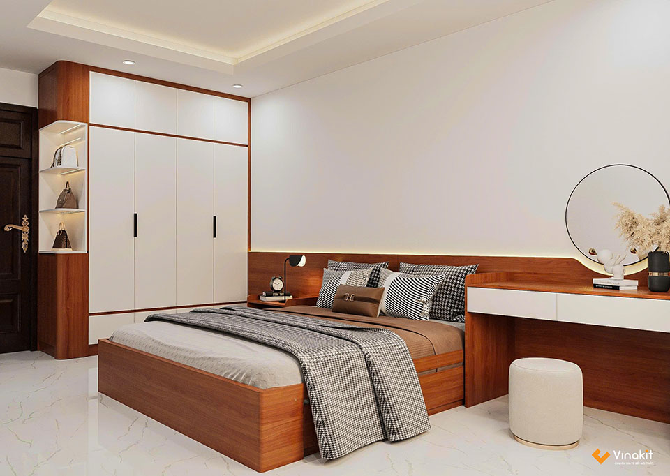 Bộ nội thất nhà phố NTNP16 được thiết kế với phong cách hiện đại đơn giản, phù hợp với nhu cầu sử dụng của gia chủ. Bộ nội thất phòng ngủ, phòng khách, bếp được Kiến trúc sư Vinakit thiết kế đồng bộ, cùng một màu sắc khiến cho tổng thể không gian thêm phần ấm cúng, hiện đại và tinh tế hơn.