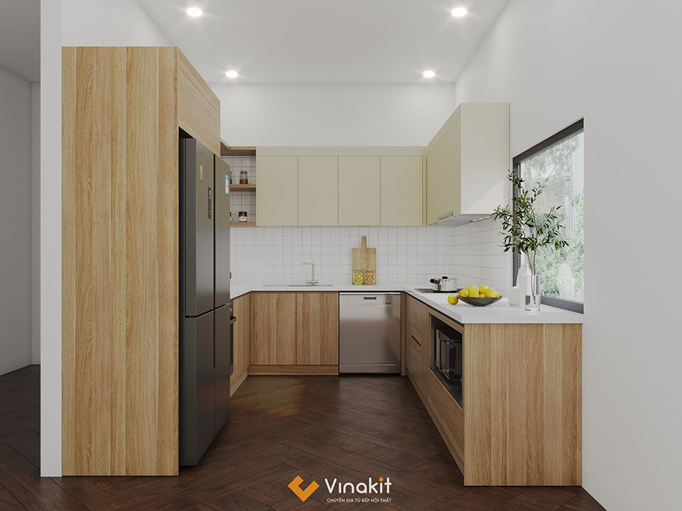 | Kiểu dáng | Tủ bếp chữ L kịch trần kết hợp bàn đảo |