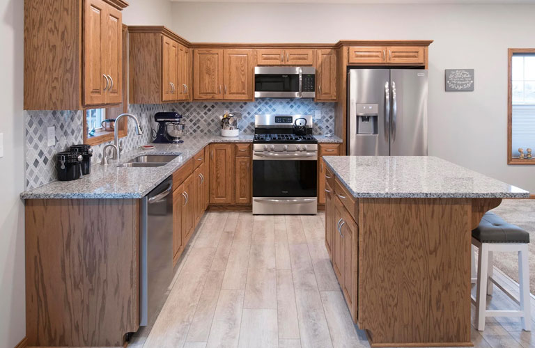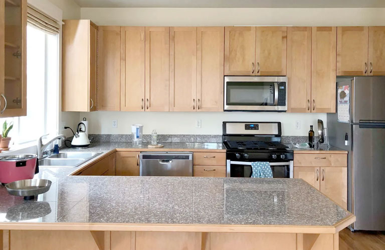 - Bố trí hợp lý: Tiến hành đo diện tích tổng thể và kết cấu của bếp để chọn bố cục tủ bếp, chẳng hạn như chữ I, L, U hoặc có đảo bếp, phù hợp.
