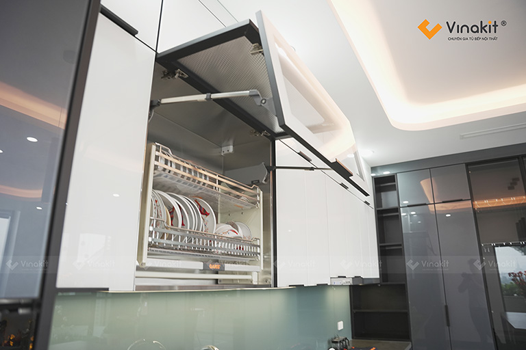 Khách hàng gian bếp nhỏ, các chuyên gia Vinakit gợi ý tới khách hàng nên sử dụng loại cánh kính cường lực hoặc cánh Acrylic bóng gương với thiết kế hiện đại, dễ dàng vệ sinh, bên bỉ. Ngoài ra, phần cánh giúp phản chiếu ánh sáng, mang đến nhiều ánh sáng cho không gian bếp. Giúp căn bếp thêm thống thoáng hơn. Ngoài ra phần màu sắc cũng đa dạng, nhiều sự lựa chọn hơn.