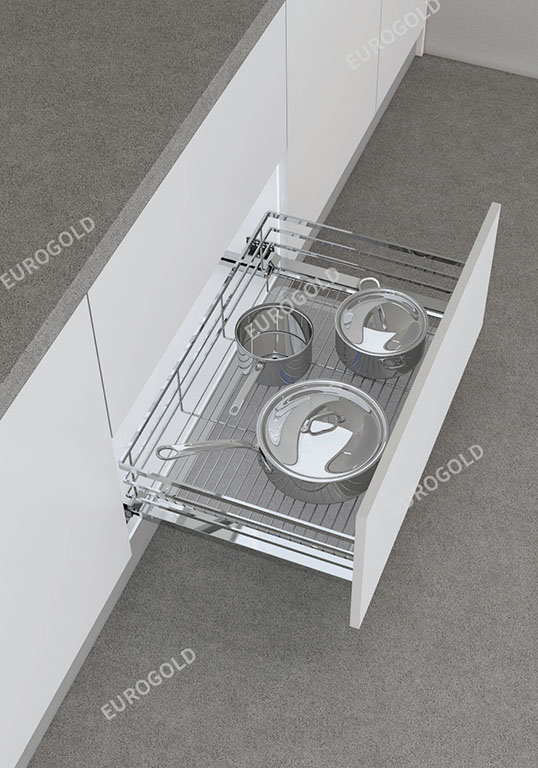 Sản phẩm giá xoong nồi này là một phụ kiện tủ bếp với hai ray trượt được gắn vào 2 bên hộc tủ, giảm chấn tích hợp giúp giá chuyển động trượt ra vào êm ái, không gây tiếng ồn. Chỉ với thao tác kéo nhẹ cánh tủ, bạn có thể dễ dàng nhìn thấy toàn bộ giá, giúp việc sắp xếp và sử dụng xoong nồi bát đĩa trở nên dễ dàng hơn.