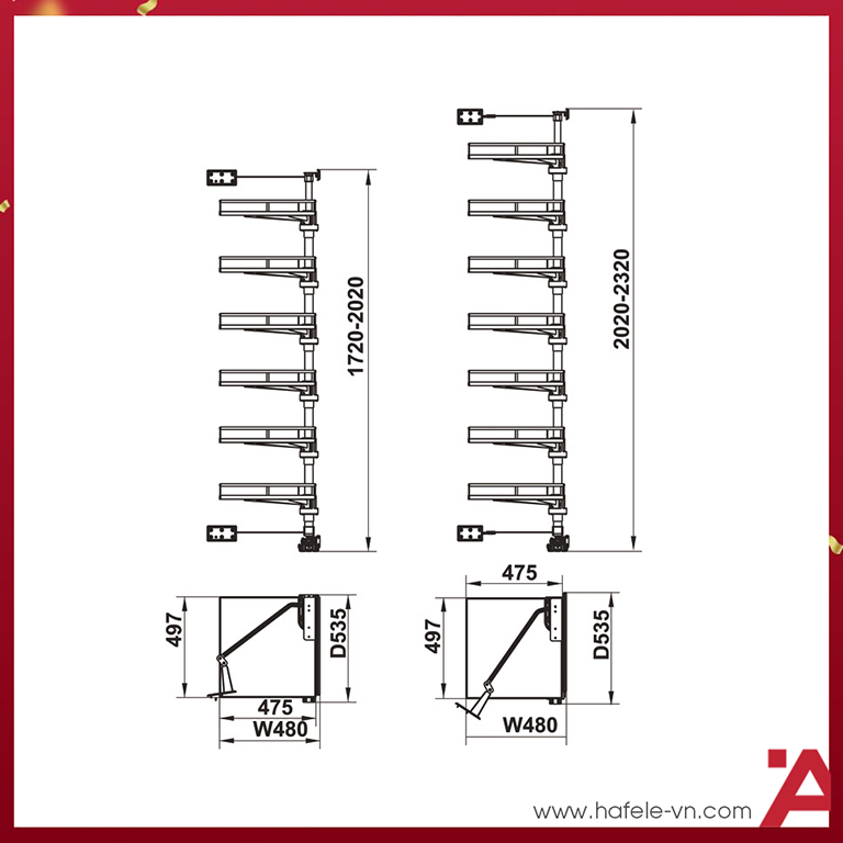 | Kích thước | R480 x S535 x C (1720-2020)mm |