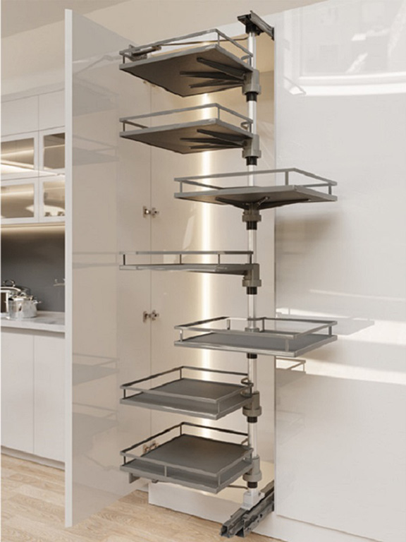 Đây là sản phẩm phụ kiện tủ bếp gồm nhiều khay kệ hình vuông hoặc chữ nhật, có thành viền chắc chắn để giữ đồ dùng không bị rơi. Đáp ứng nhu cầu lưu trữ lớn nhưng vẫn dễ dàng sắp xếp và lấy đồ. Đây là sản phẩm nên có trong mỗi gian bếp, phù hợp với nhiều phong cách thiết kế nội thất khác nhau.