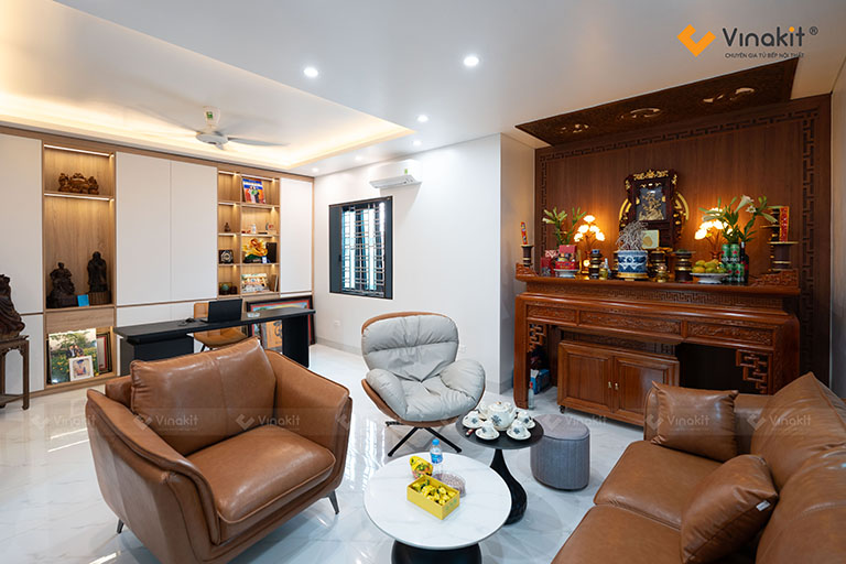 Điểm nổi bật của Vinakit còn nằm ở đội ngũ thiết kế và thi công – những người không chỉ có chuyên môn cao trong lĩnh vực nội thất, mà còn am hiểu sâu sắc về văn hóa thờ cúng và phong thủy truyền thống Á Đông. Nhờ đó, các sản phẩm nội thất phòng thờ do Vinakit thực hiện luôn thể hiện được sự thành kính, sự hài hòa trong bố cục, ánh sáng và hướng đặt. Chúng tôi luôn chú trọng đến từng chi tiết nhỏ như kích thước bàn thờ, khoảng cách bài vị, vách ngăn hay các vật phẩm thờ cúng đi kèm, nhằm tạo nên không gian trang nghiêm nhưng vẫn gần gũi với tổng thể kiến trúc ngôi nhà.