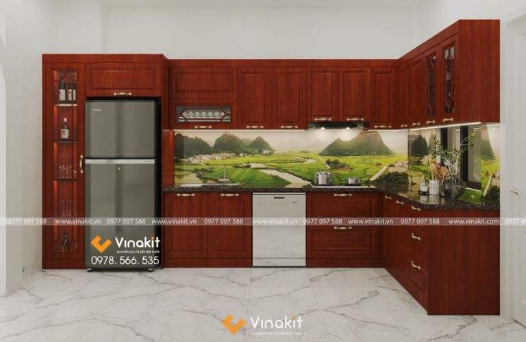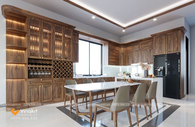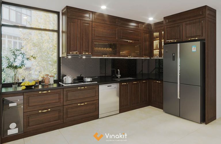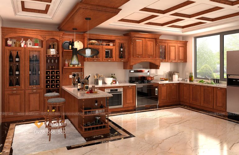 | Lủ bếp gỗ óc chó Vinakit OCC11 chữ L cổ điển | Tủ bếp gỗ hương Vinakit chữ L – GH11 phong cách tân cổ điển |