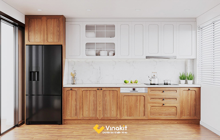 Tại TP.HCM, kiểu tủ bếp này đặc biệt được ưa chuộng bởi những gia chủ yêu thích sự ấm áp, mộc mạc và gần gũi, giúp gian bếp trở thành nơi sum họp gia đình đầy thân thiện và thoải mái.