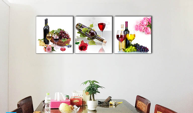 Biến hóa căn bến thêm phần lãng mạn và cuốn hút, thay vì lựa chọn những gam màu trầm tối, bạn có thể thử lựa chọn những bức tranh với hình rượu và trà mang đến nhiều năng lượng và sức sống cho căn bếp và tổng thể căn nhà của bạn.