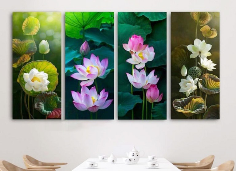Mang ý nghĩa thanh tịnh thuần khiết, hóa giải các năng lượng tiêu cực. Tranh hình hoa sen giúp cân bằng hỏa khí trong gian bếp. Cực phù hợp với gia chủ mệnh Thủy hoặc mệnh Mộc.