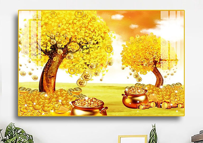Với ý nghĩa giúp thu hút may mắn tài lộc và tiền tài, gia chủ trao bức tranh này với mong muốn mang đến nhiều vận may cho gia đình. Thích hợp treo nơi nhiều ánh sáng, trên gần bàn ăn.