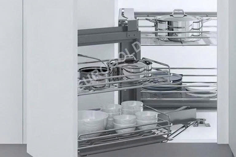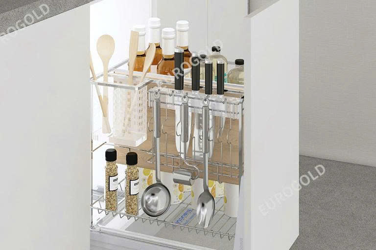Phụ kiện góc tủ như kệ liên hoàn hoặc mâm xoay Eurogold giúp tận dụng tối đa không gian góc tủ vốn bị bỏ trống trong nhiều thiết kế. Hệ thống di chuyển nhẹ nhàng cho phép lấy đồ dễ dàng mà không cần khom lưng hoặc với tay quá xa