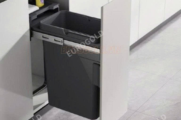 Mẫu thùng rác gắn cánh Eurogold được nhiều người ưu tiên vì kiểu dáng gọn, dễ lắp đặt dưới đáy tủ và hệ ray giảm chấn giúp thao tác nhẹ nhàng. Thiết kế đóng mở kín, giữ mùi, phù hợp với bếp hiện đại