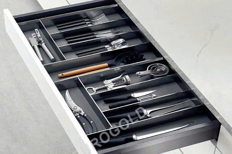Khay chia thìa dĩa giữ dao kéo, thìa, dĩa rất gọn gàng trong ngăn kéo. Trong khi đó, giá treo ngoài Eurogold giúp tận dụng mặt trong cánh tủ hoặc vách hông để treo đồ nhỏ như khăn, dao, chai lọ. Những chi tiết nhỏ này mang lại sự chuyên nghiệp và tiện dụng cho không gian bếp