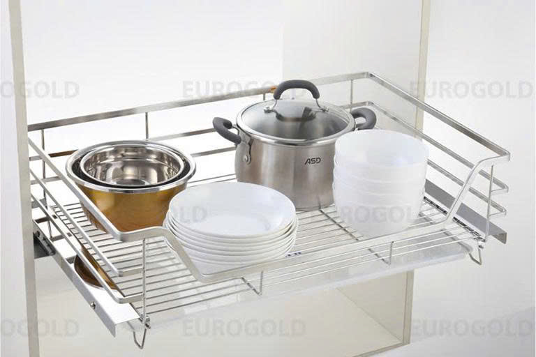 Giá xoong nồi Eurogold đa dạng kiểu dáng: gắn cánh, âm tủ hoặc dạng kéo. Các mẫu thiết kế thấp, tích hợp ray giảm chấn, giúp lưu trữ xoong nồi thông minh và tiếp cận dễ dàng. Chất liệu inox không gỉ giúp sản phẩm luôn bền và sạch sẽ theo thời gian