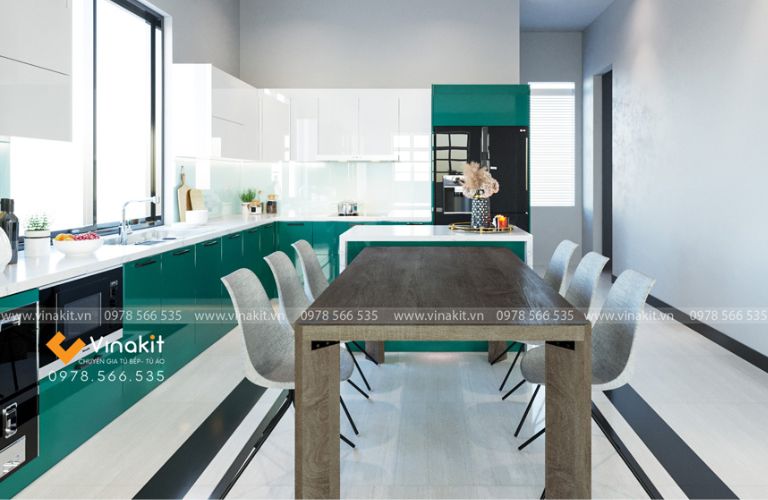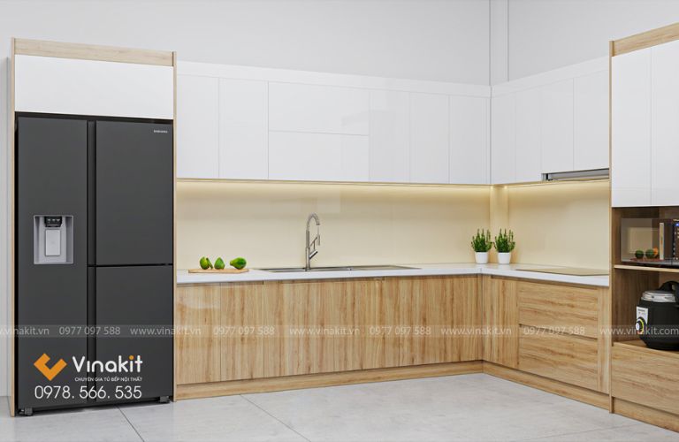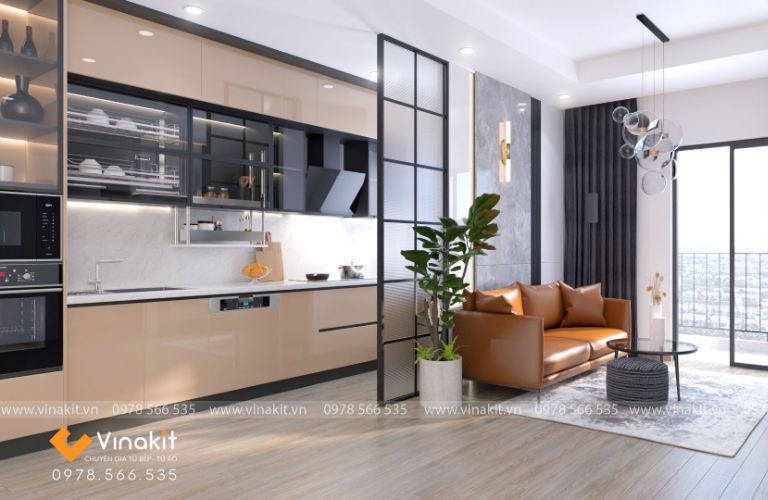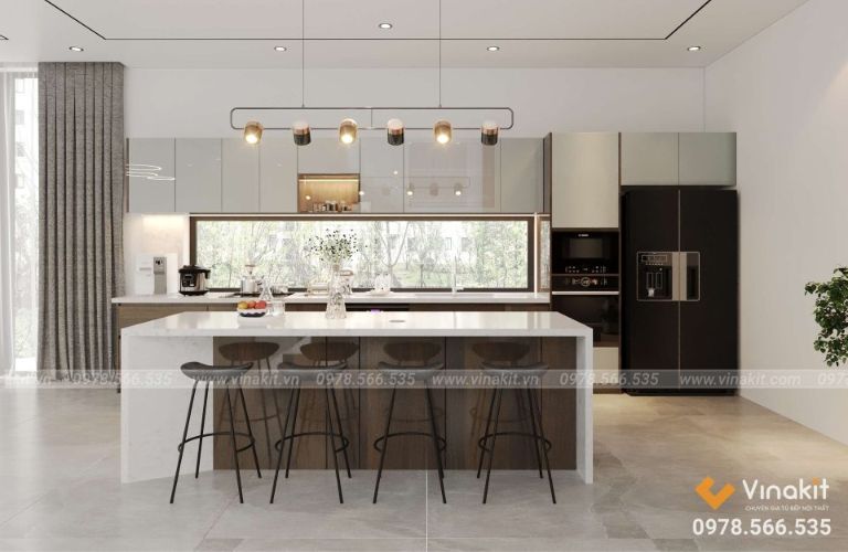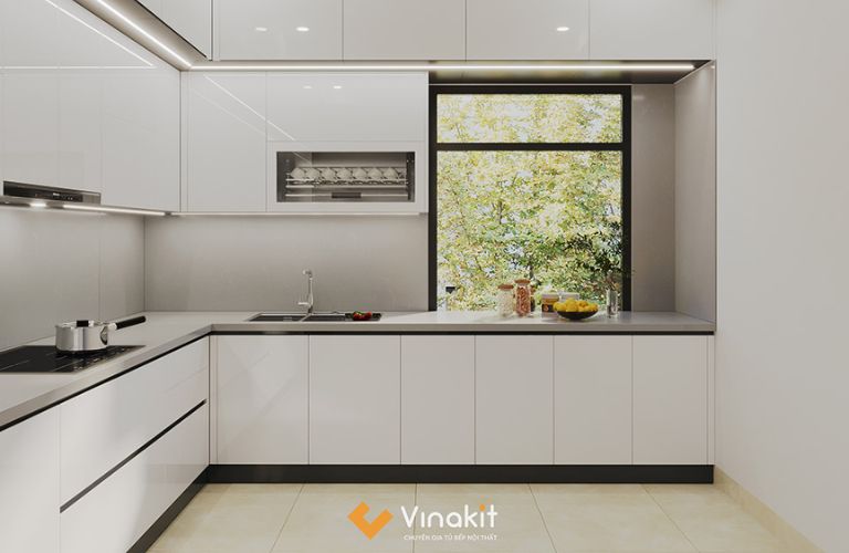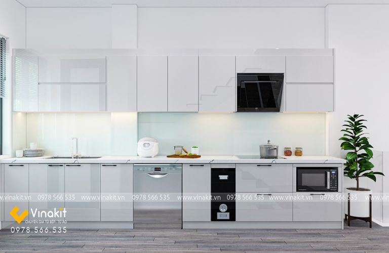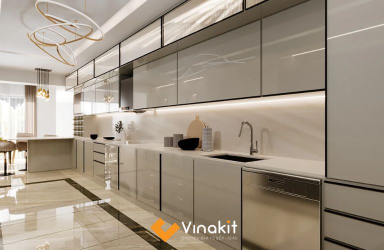 Bề mặt Acrylic bóng loáng không chỉ làm tăng tính thẩm mỹ mà còn giúp không gian bếp trở nên rộng rãi và sáng sủa hơn. Các sản phẩm của Vinakit luôn được chăm chút tỉ mỉ, từ khâu thiết kế đến lắp đặt, mang đến sự hoàn hảo trong từng chi tiết.