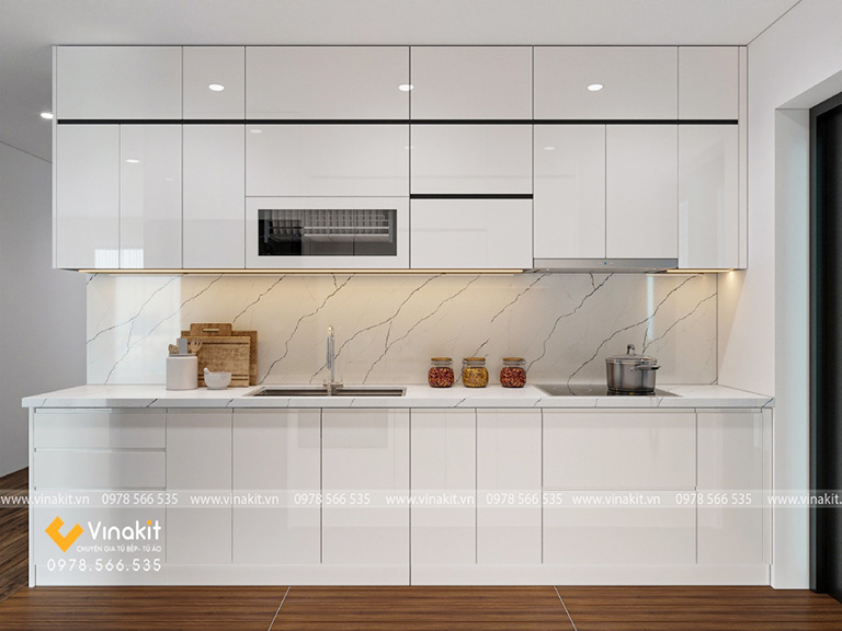 Bề mặt bóng mịn, sang trọng: Lớp phủ Acrylic mang đến vẻ ngoài hiện đại, sáng bóng và tinh tế, giúp căn bếp trở nên rộng rãi, thoáng sáng và sang trọng hơn.